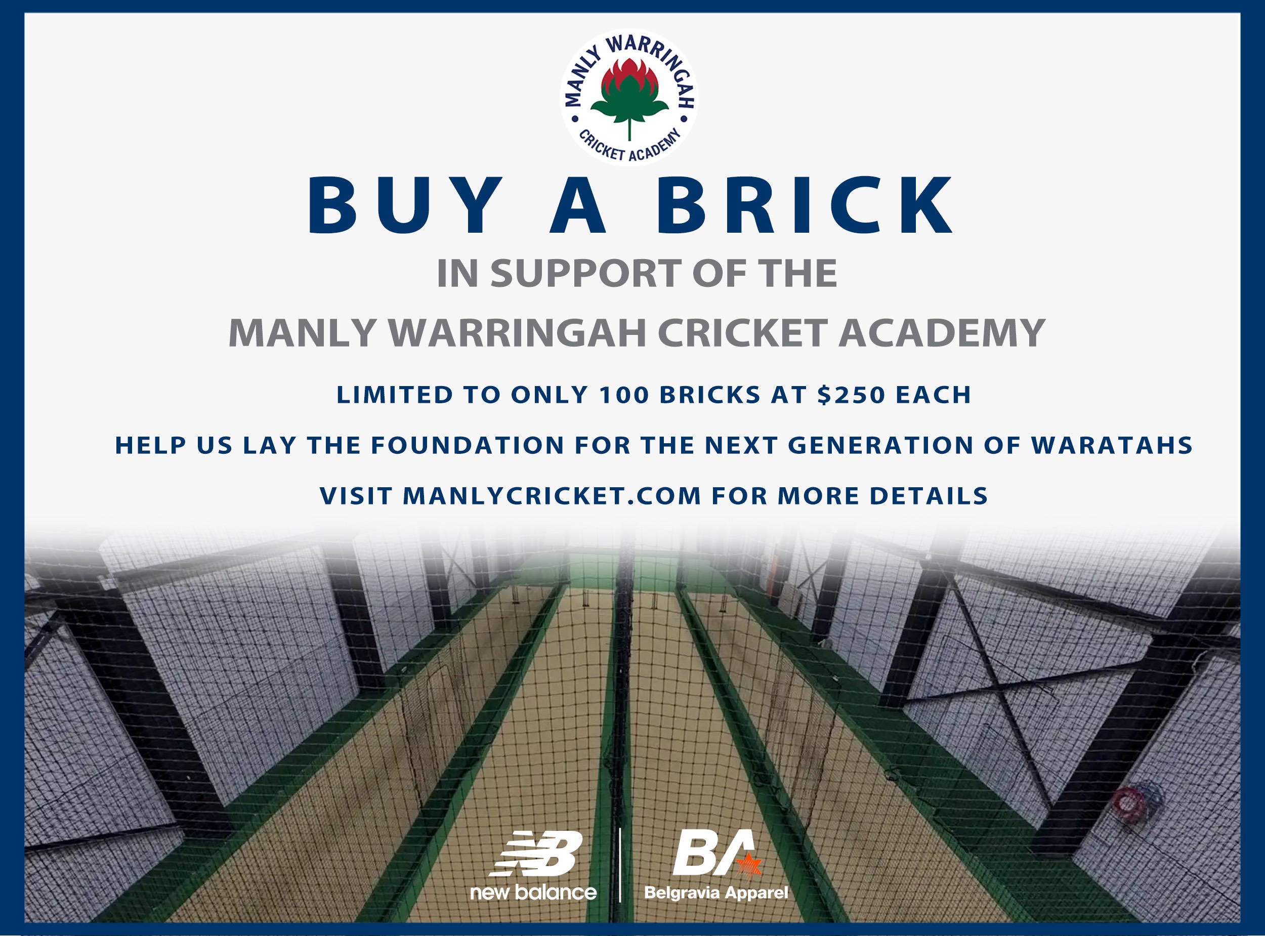 Help us lay the foundation for the next generation of Manly cricketers. By purchasing a Brick for our brand-new Indoor Training Centre at the Belgravia Apparel Manly Warringah Cricket Academy, you’re directly supporting the development of young players and strengthening the future of our club. Every brick represents more than construction material — it’s a symbol...Read More