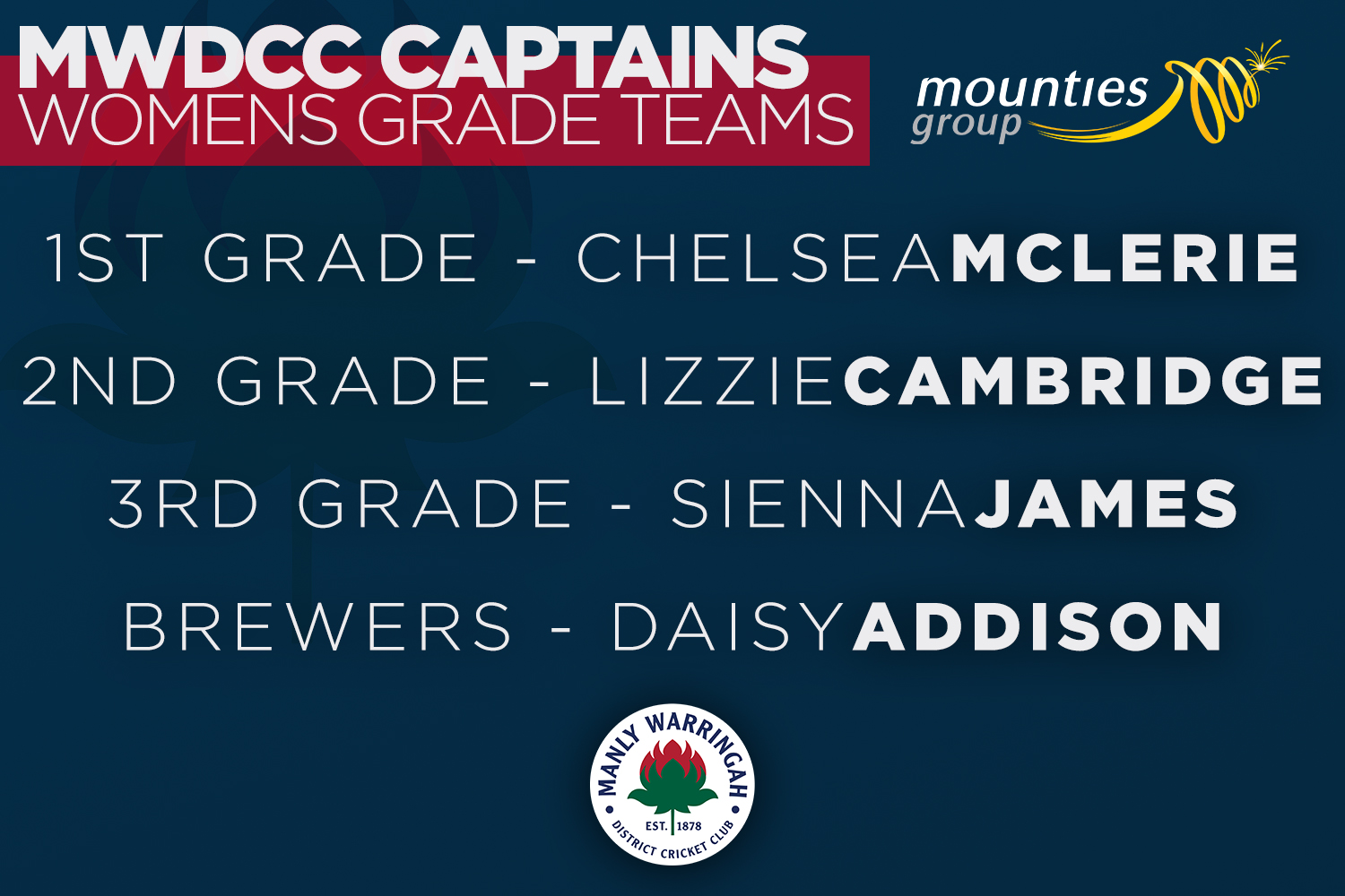 The Mounties Manly Warringah Waratahs are proud to confirm our Women’s Premier Cricket captains for the 2025/26 season. 1st Grade will be led by Chelsea McLerie, who takes the reins from Lauren Kua. A local junior and long-standing member of the playing group, Chelsea’s appointment marks an exciting new chapter for our top women’s side....Read More